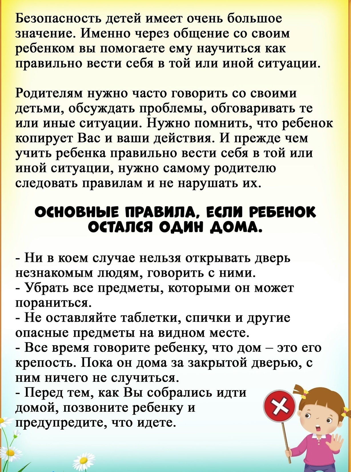 Необходимо напоминать правила безопасности своему ребёнку ЕЖЕДНЕВНО, потому что именно родители несут ответственность за жизнь и здоровье своих детей.